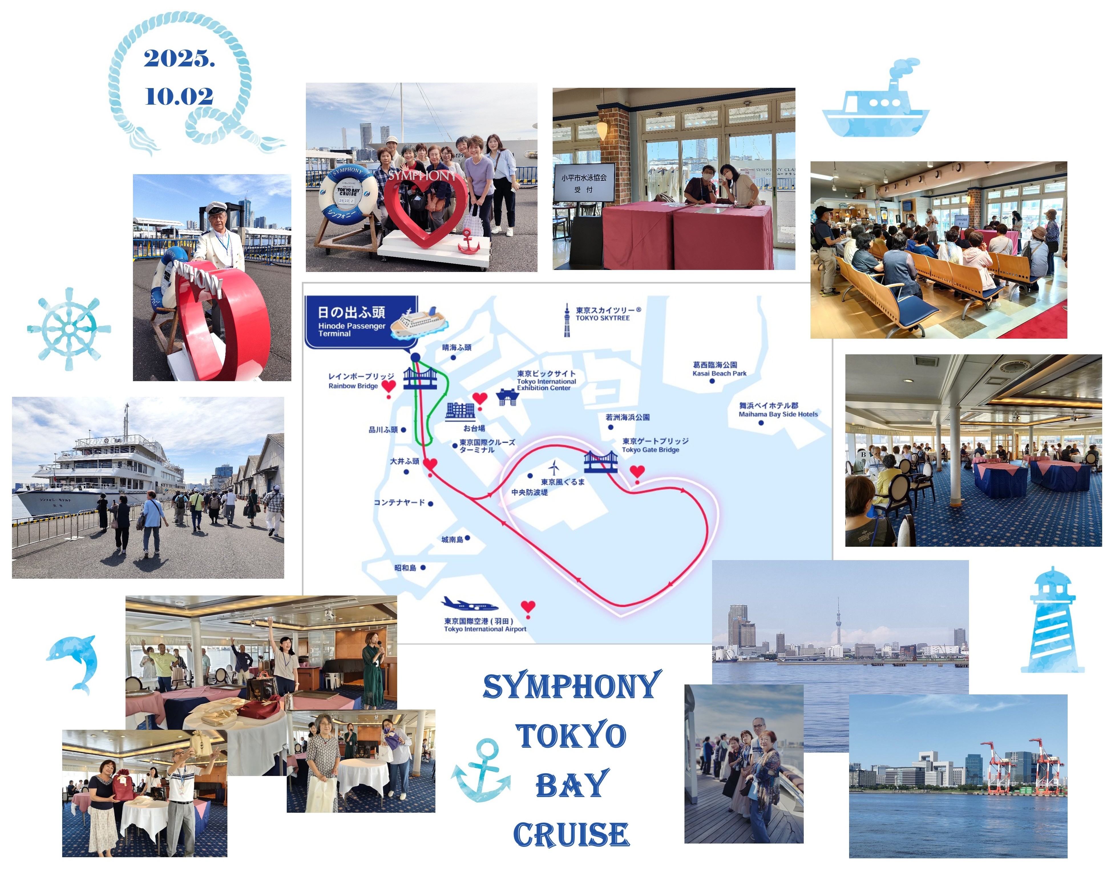 前日の雨が嘘のように晴れ渡った10月2日、小平市水泳協会が企画した東京湾ランチクルーズに参加しました。当日は、鷹の台駅集合組み、現地 日の出桟橋集合組み合わせて50数名の大所帯で、乗船したモデルナ号の3Fの前部の一室を貸切り、数名ずつに分かれたテーブルで賑やかに、楽しく、美味しくランチを頂きました。クルーズは全体で2時間ちょっとで東京湾内を回るルートですが、天候にも恵まれ羽田空港の多数の発着便を見たり、お台場を見たりの最高のクルーズ日和、また水泳教室だけではなかなかお話しできない方々ともちょっぴりお近付きになれ、有意義で、とても楽しく過ごすことが出来ました。