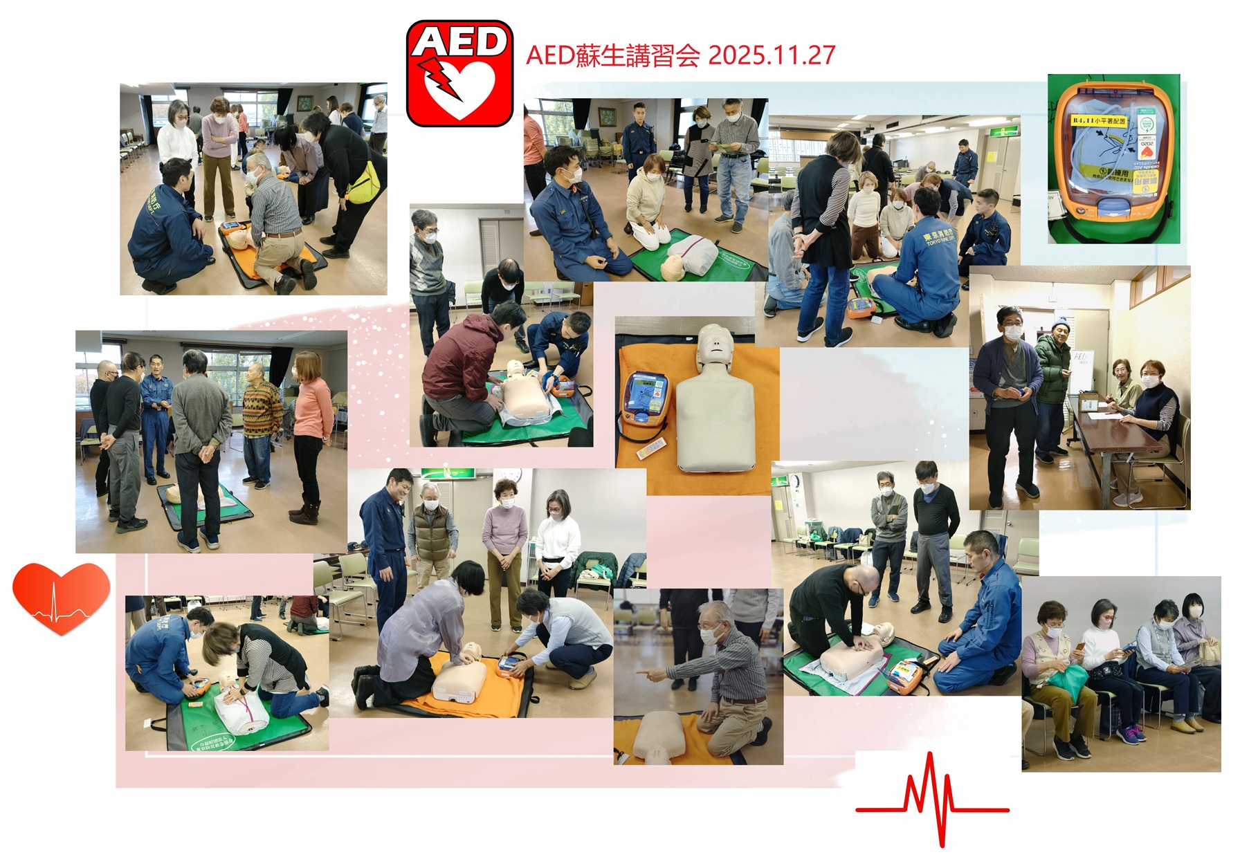当日は消防署から4人の署員を講師に迎え、22名の参加者が心肺蘇生法やAEDの使用方法について学びました。実技は、皆が時間を忘れるほど真剣に心臓マッサージに取り組み、活発な質問が飛び交う場面もありました。専門的な内容に講師の方々も思わず苦笑するほど、参加者の関心と熱意が感じられる講習となりました。
